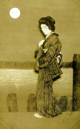 The actor Nakamura Fukusuke V playing the role of Suke-no-Tsubone in the "Daimotsu no Ura" scene of the drama "Yoshitsune Senbon Zakura", which was staged in June 1928 at the Meijiza |
