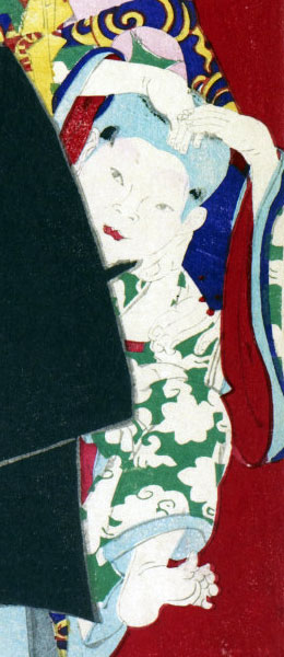 Ichikawa Ginzô II performing the role of Yasomatsu in a drama similar to "Hikosan Gongen Chikai no Sukedachi" in a print made by Toyohara Kunichika in 1888 |