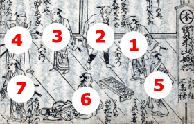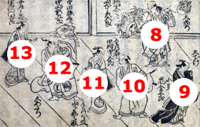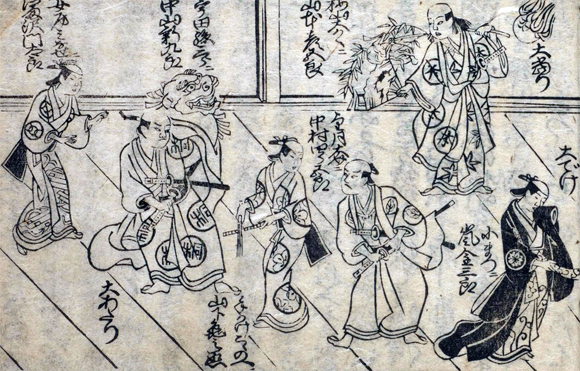 Others actors were Nakamura Shirogorô II & Tsuzuki Daizaburô in the roles of Nagasakiya Jinroku & the Igaya decchi. [1] "I worked on this kaomise page in November 2025, almost 300 years afterwards!" (Shôriya Aragorô) [2] Our definition of star is a ranking equal or above jô-jô-kichi. [3] Ikoma Hachirozaemon or Ikoma Hachirôzaemon? Two possible readings. [4] Ikuyo-hime. [5] He also played the roled of the rônin Jûheiji. |