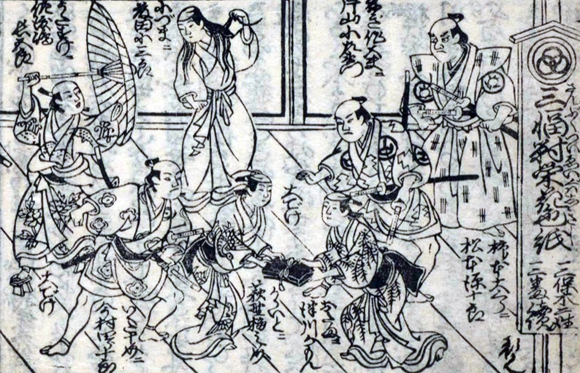 The kaomise drama "Sanpukutsui Eiga no Shikishi" was produced by Mihogi Gizaemon I at Miyako Mandayû's theater in Kyôto in the 11th lunar month of 1725 [1]. It was staged with the following casting: