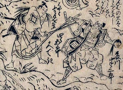 Nakamura Shirogorô III (right) and Fujikawa Hanzaburô III (left/holding the severed head of Tsuchimatsu) playing the roles of Gonshirô and Banba no Chûta in the "Sasabiki" scene of the drama "Hirakana Seisuiki", which was staged in the 7th lunar month of 1760 at the Naka no Shibai The Nakamura Shirogorô line of actors |
