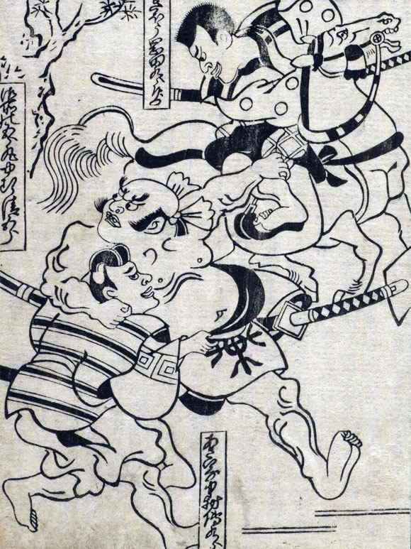 Nakamura Denkurô I (bottom/left) and Ichikawa Danjûrô I (top/right) playing the roles of Asahina no Saburô and Soga Gorô Tokimune in the 2nd scene of the 4th act of the drama "Tsuwamono Kongen Soga", which was staged in the 5th lunar month of 1697 at the Nakamuraza |