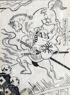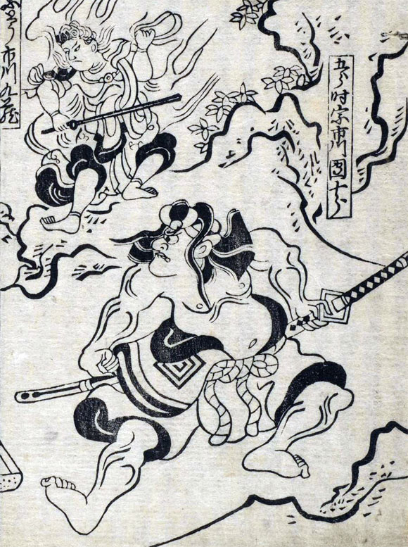 Ichikawa Kuzô I (top/left) and Ichikawa Danjûrô I (bottom/center) playing the roles of the deity Fudô Myôô and Soga Gorô Tokimune in the 4th scene of the 2nd act of the drama "Tsuwamono Kongen Soga", which was staged in the 5th lunar month of 1697 at the Nakamuraza |