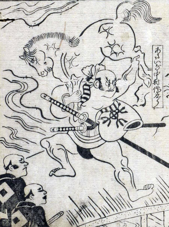 Nakamura Denkurô I (center) playing the role of Asahina no Saburô in the 4th scene of the 2nd act of the drama "Tsuwamono Kongen Soga", which was staged in the 5th lunar month of 1697 at the Nakamuraza |