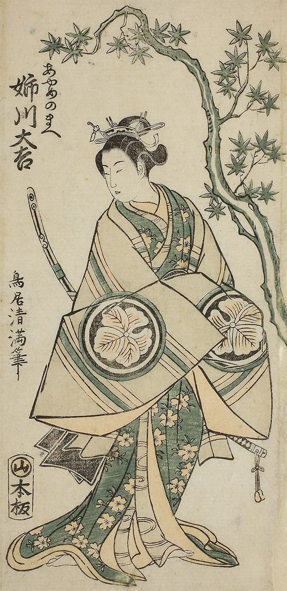 The Actor Anegawa Daikichi I as Ayame-no-Mae in the play "Miyo no Hana Yunzei Kagami," performed at the Morita Theater in the eleventh month, 1760 The Anegawa Daikichi line of actors |