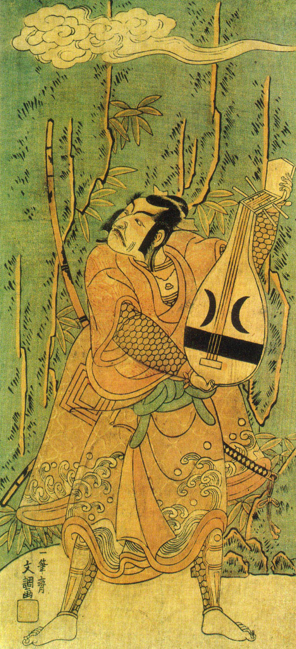 | The actor Ichikawa Danjûrô IV playing the role of Kagekiyo in the drama "Soga Moyô Aigo no Wakamatsu", which was staged at the Nakamuraza in the 1st lunar month of 1769 (print made by Ippitsusai Bunchô) |