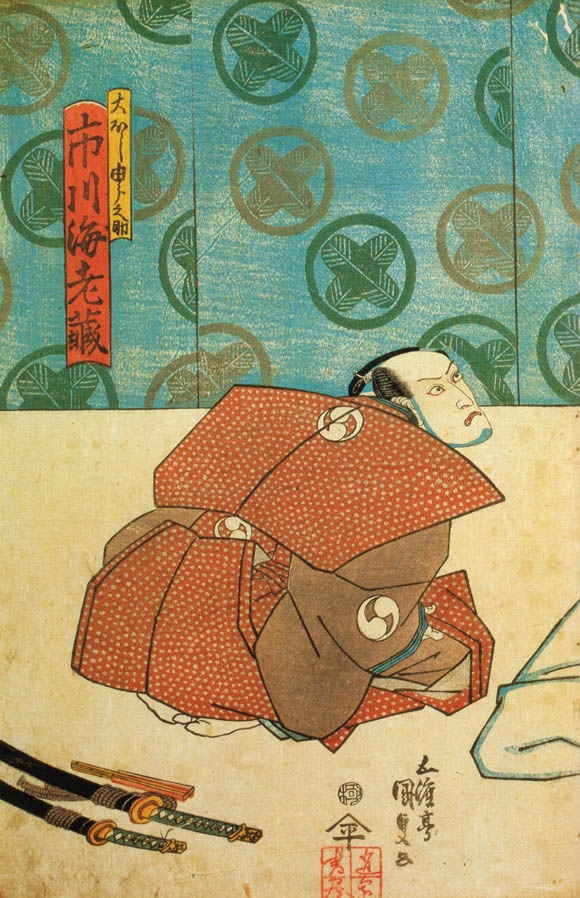The actor Ichikawa Ebizô V playing the role of Yuranosuke in the fourth act ("Hangan Seppuku") of the drama "Kanadehon Chûshingura", which was staged in the 3rd lunar month of 1833 at the Kawarasakiza (print made by Utagawa Kunisada I) |