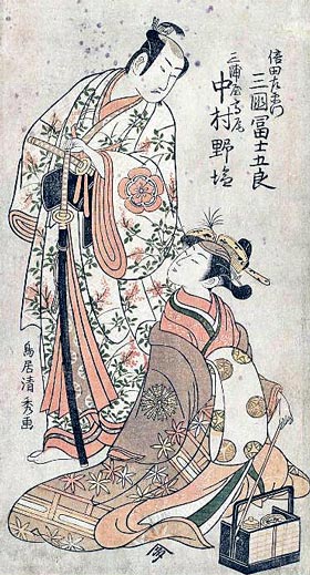 Mikuni Fujigorô (left/standing) and Nakamura Noshio I (right/bottom) in a print made by Torii Kiyohide in 1772 The Nakamura Shirogorô line of actors |