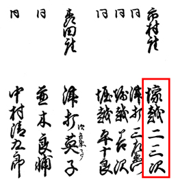 The name of Horikoshi Nisôji II in a 1871 Edo Nakamuraza yakuwari banzuke (the zone within the red shape) |