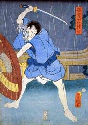 The 100-pile breakwater (hyapponkui) by the Inase river In the story the young priest, Seishin is discovered to be having a love affair with the geisha. Izayoi, and is banished as a punishment. Izayoi follows, begging to be allowed to accompany him but he refuses. When she eventually tells him that she carries his child, they decide that the only way out of their predicament is to die together. They leap into the river. The highlight of this first scene is the kudoki performed by Izayoi as she pleads with Seishin to take her with him. This is accompanied by extremely beautiful Kiyomoto music. Though both characters try to drown themselves, neither actually succeeds, and in the second scene Izayoi is caught up in a large fishing net belonging to the poet Hakuren and is saved. It is the third scene however, that proves the most interesting. Seishin also hasn't drowned because he says he is too good a swimmer, an excuse that hints at his lack of backbone and weakness. As he fills his sleeves with stones in another attempt at death by drowning, his character is tested further. Along comes a young page by the name of Motome carrying 50 gold pieces. As he enters on the hanamichi both actors speak alternately in a passage of rhythmic dialogue that is superb to hear. The boy has an attack of cramps and falls to the ground in pain. At first Seishin tries to help by massaging his chest, but when he discovers the packet of money, his nature gradually changes from that of a weak but harmless young man into that of a far more sinister character. With nothing left to lose, Seishin resolves to become a thief. After much soul-searching, Seishin murders the boy and steals the money. Text courtesy of Paul M. Griffith A brief summary of usually-ommitted acts Izayoi, who became Hakuren's mistress and took back her real name Osayo, decides to shaves her head and become a nun in order to pray for Seishin's soul, whom she believes dead. She leaves Hakuren, going on pilgrimage to Hakone, but she is abducted in the valley of Hell (Jigoku no Tani) by a bunch of highwaymen. She is rescued by another bandit named Seikichi and nicknamed Oniazami ('the Demon thistle'), who is none other than Seishin. Seikichi persuades Osayo to abandon her religious life and they become partners in crime. Their first evil plan is to blackmail Hakuren. At Hakuren's mansion (2 occasionally-performed scenes) Seikichi and Osayo confront Hakuren, only to find that he is a greater villain than they are. He has broken into the Shôgun's tresury and stolen a fabulous amount of golden pieces. They also realize that Hakuren, whose real name is Ôdera Shôbê, is the brother of Seikichi. They learn as well that Motome, the young page, who was murdered by Seishin, is in fact Izayoi's younger brother. Seikichi and Osayo, feeling the agonies of remorse, successfully commit their shinjû and Shôbê is arrested by the police. |