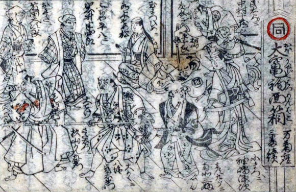 The kaomise drama "Ôkamado Hatsumen Bako" was produced by Sanogawa Mangiku at Hayagumo Chôdayû's theater in Kyôto in the 11th lunar month of 1725 [1].
