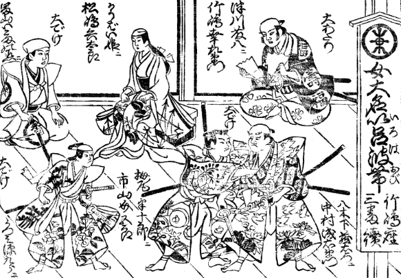 The kaomise drama "Onna Daimyô Iroha Obi" was produced in the 11th lunar month of 1719 [1] in Ôsaka at the Naka no Shibai by Takeshima Kôzaemon II. The opening day was the 13th day of the 11th lunar month of the 4th year of the Kyôhô era, which was the 23rd of December 1719 in the western calendar. This kaomise program was staged with the following casting: