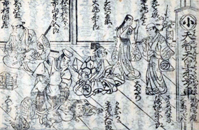 The kaomise drama "Tenchi Tennô Sokutai Guruma" was produced in the 11th lunar month of 1722 [1] in Ôsaka at the Higashi no Shibai by Arashi Kanshirô I. This kaomise program, without any jô-jô-kichi actor, was staged with the following casting:
