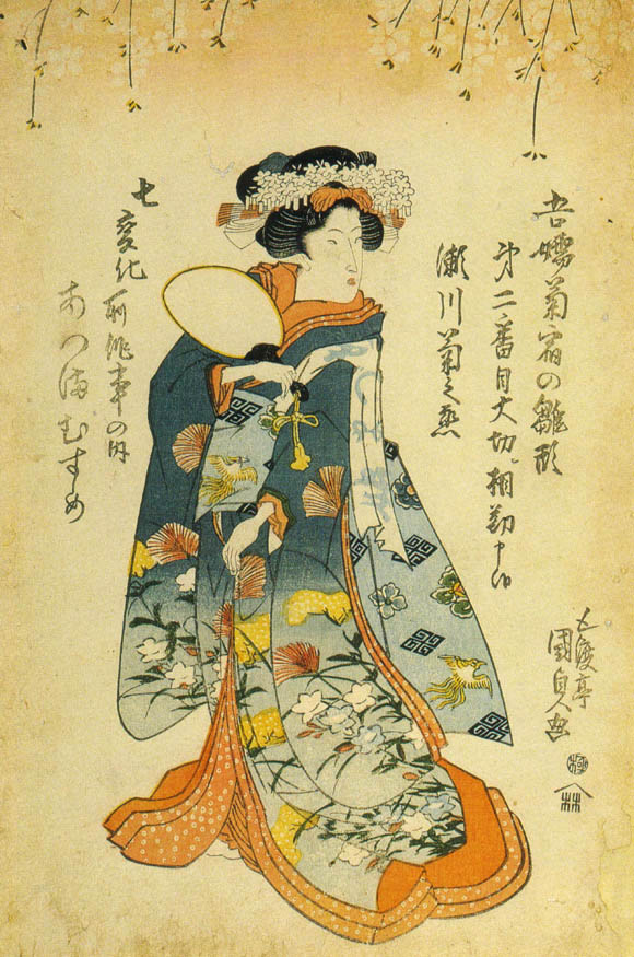 The actor Segawa Kikunojô V playing the role of an eastern province maiden in the 7-roles hengemono "Azuma Gigu Yayoi no Hinagata", which was staged in the 3rd lunar month of 1821 at the Nakamuraza (print made by Utagawa Kunisada I) |