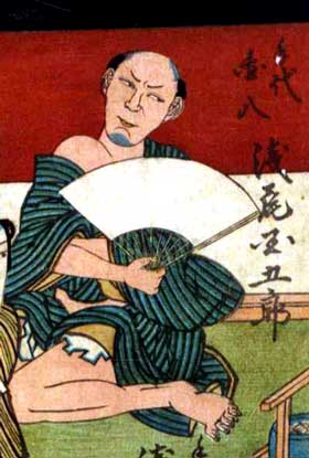 Asao Kunigorô III playing the role of the tedai Danpachi in the drama "Gokusaishiki Musume Ôgi", which was staged in the 7th lunar month of 1826 at the Naka no Shibai Print made by Shunkôsai Hokushû in 1822 Print made by Utagawa Kunihiro in 1827 The Asao Kunigorô line of actors |