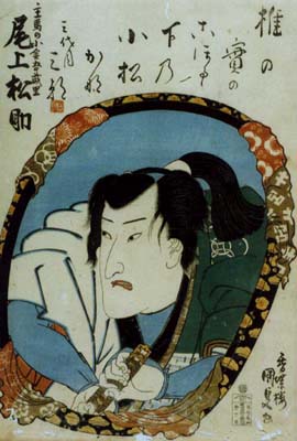 Guild: Otowaya Line number: SANDAIME (III) Poetry name: Sanchô Existence: 1805 ~ 2nd day of the 7th lunar month of 1851 [1] Connections: Father: Onoe Kikugorô III Brothers: Onoe Eizaburô IV, Onoe Kikunosuke Career: 1805: born in Edo. 11th lunar month of 1808: he made his first stage appearance at the Ichimuraza, performing in the kaomise drama "Irosoyuru Nidai Genji" which welcomed in Edo the Kamigata actor Sawamura Tanosuke II and celebrated the shûmei of Nakamura Rikô II. 6th lunar month of 1809: premiere at the Moritaza of Katsu Hyôzô I's drama "Okuni Gozen Keshô no Sugatami"; Asajirô played the role of Sasaki Toyowakamaru [casting]. 11th lunar month of 1809: great shûmei at the Ichimuraza for the Otowaya guild; Onoe Matsusuke I, Onoe Eizaburô I and Onoe Asajirô respectively took the names of Onoe Shôroku I, Onoe Matsusuke II and Onoe Eizaburô II, performing in Tsuruya Nanboku IV's kaomise drama "Misao no Hana Toba no Koizuka". 11th lunar month of 1814: Onoe Matsusuke II and Onoe Eizaburô II respectively took the names of Onoe Baikô III and Onoe Matsusuke III at the Nakamuraza, performing together in the kaomise drama "Ninin Muko Mikurai Sadame". 7th lunar month of 1821: premiere at the Kawarasakiza of Tsuruya Nanboku IV's drama "Tamamo-no-Mae Kumoi no Hareginu", which mixes the sekai of Gion no Nyôgo, the Two Shinbê ("Ninin Shinbê") and Tamamo-no-Mae; Matsusuke played the role of the ueki-uri Terashima no Matsu [more details]. 9th lunar month of 1821: premiere at the Kawarasakiza of Tsuruya Nanboku IV's drama "Kiku no En Tsuki no Shiranami"; Matsusuke played the role of Ishidô Kazumanosuke [more details]. 11th lunar month of 1821: Onoe Matsusuke III took the name of Onoe Sanchô at the Kawarasakiza, performing in Tsuruya Nanboku IV's kaomise drama "Imoseyama Hitome Senbon", which mixed the "Yoshitsune Senbon Zakura" and "Imoseyama Onna Teikin" worlds [casting]. 1st lunar month of 1823: premiere at the Ichimuraza of Tsuruya Nanboku IV's new year sogamono drama "Yaegasumi Soga no Kumiito"; Sanchô played the role of Soga no Zenjibô [casting]. 7th lunar month of 1823: premiere at the Ichimuraza of Tsuruya Nanboku IV's natsu kyôgen "Torimazete Sekison Miyage"; Sanchô played the roles of Princess Yayoi and Hanesawaya Kôkichi [casting]. 11th lunar month of 1823: Onoe Sanchô took the name of Onoe Matsusuke III at the Nakamuraza, performing in the kaomise drama "Kaeri Giso Kiku no Hitomure". 1st lunar month of 1825: premiere at the Nakamuraza of Tsuruya Nanboku IV's new year sogamono drama "Okuni-iri Soga Nakamura"; Matsusuke played the roles of Soga no Zenjibô and Futabaya Senkichi [casting]. 7th lunar month of 1825: Matsusuke played at the Nakamuraza the role of Ôboshi Rikiya in the drama "Kanadehon Chûshingura". 7th lunar month of 1825: premiere at the Nakamuraza of Tsuruya Nanboku IV's ghost play "Tôkaidô Yotsuya Kaidan"; Matsusuke played the role of Okuda Shôzaburô [casting]. 6th lunar month of 1827: premiere at the Kawarasakiza of Tsuruya Nanboku IV's drama "Hitori Tabi Gojûsan Tsugi"; Matsusuke played the roles of Ishii Hanjirô, Omatsu's sister Osode and the taiko mochi Kisaku [casting]. 4th lunar month of 1848: Onoe Kikugorô III and Onoe Matsusuke III respectively took the names of Ôkawa Hashizô I and Ôkawa Sanchô in Nagoya. 8th lunar month of 1848: he settled in Ôsaka with his father. 24th day of the 4th lunar month of 1849 [2]: his father Ôkawa Hashizô I died on the way back to Edo. 1850: Ôkawa Sanchô took back the name of Onoe Matsusuke III. 5th lunar month of 1851: Matsusuke played at the Kawarasakiza the role of Kobotoke Kohei in the drama "Tôkaidô Yotsuya Kaidan", which commemorated the 2nd anniversary (3rd memorial service) of the death of Onoe Kikugorô III. 2nd day of the 7th lunar month of 1851 [1]: Matsusuke died in Edo. Comments: Onoe Matsusuke III was a tachiyaku, who was the son of a Kabuki giant but made an average career in the first half of the nineteenth century. [1] The 2nd day of the 7th lunar month of the 4th year of the Kaei era was the 29th of July 1851 in the western calendar. [2] The 24th day of the 4th lunar month of the 2nd year of the Kaei era was the 16th of May 1849 in the western calendar.