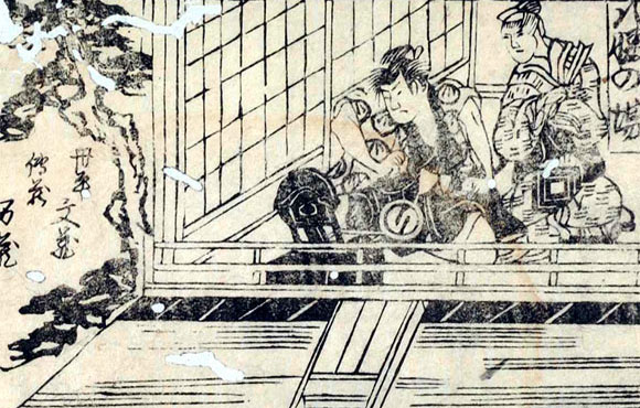 The actors Sawamura Gennosuke I (first from left) and Ichikawa Monzaburô II (first from right) playing the roles of Nuregami Chôgorô and Okô in the "Hikimado" act of the drama "Futatsu Chôchô Kuruwa Nikki", which was staged in the 6th lunar month of 1805 at the Ichimuraza The Ichikawa Monzaburô line of actors The Nakayama Ihachi line of actors |