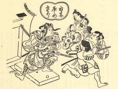 Mizuki Tatsunosuke I (left) playing the role of Arima no Ofuji in a yari odori, included in the drama "Onna Katakiuchi", which was staged in the 3rd lunar month of 1691 at the Nakamuraza |