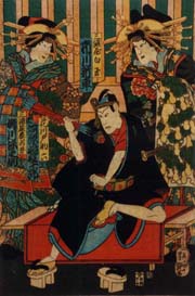 The scene is the center of Edo's licensed red light district. Cherry trees are in full bloom against a hazy spring evening. In front of Miuraya Teahouse are several courtesans who are awaiting their celebrated colleague, Agemaki. They accused Agemaki of being drunk. She protests, but stumbles, and her attendants make her drink some sobering medicine and lead her to a bench to rest. A letter has been delivered to Agemaki. It is from Sukeroku's mother, who tells Agemaki to cast off her son, because he is supposed to be avenging his father's murder, and that it is no time for him to come constantly to the licensed quarters and waste his time in unseemly brawls. But Agemaki loves Sukeroku so deeply that she cannot bear to pass a night without seeing him. In the meantime, one of Agemaki's attendants comes, announcing that the elderly samurai, Ikyû, is on his way to visit her. He has been a slave to her love. Shiratama and other ladies in the district enter and Ikyû, followed by his retainers, comes. He is a vicious old man famous in the quarter for his huge white beard, but he has money and is one of Agemaki's best clients. Ikyû at once begins to abuse Sukeroku, calling him a thief. Agemaki admits that she is perhaps foolish to be in love with Sukeroku, but calling him a thief is too much. Although Shiratama tries to calm her down, Agemaki declared that she will never have anything to do with Ikyû again and withdraws, followed by Shiratama and her attendants. The sound of a flute is heard. Sukeroku enters. The singers chant a love song as he dances. The ladies of the quarter call attention to his purple head band. They crowd around him as he steps onto the stage, offering him tobacco pipes. Ikyû, annoyed at finding himself suddenly deserted, says loudly that he wishes to smoke too, but Sukeroku insolently points out that all the pipes are in use. Sukeroku tries to provoke Ikyû, and after boasting triumphantly of his power over women, offers Ikyû a pipe holding it between his toes. Ikyû is boiling with rage, but prefers not to take up Sukeroku's challenge. At this point one of Ikyû's retainers, Kanpera Mombei, comes out of the house shouting furiously that he has been cheated by an attendant who put him into a bath and left him to stew without joining him there. He turns his anger upon everybody around him. But Kanpera and his colleagues are finally routed by Sukeroku. Then Sukeroku makes a famous speech in which he claims to be the number one person in arms and love. Ikyû's retainers attack him, but he throws them down before their master, challenging Ikyû to draw his sword. However hard Sukeroku tries to make Ikyû lose his temper so that he pulls out his sword, Ikyû never draws it saying that his sword is too noble to be spoiled by a thief's blood. Ikyû, his followers and the courtesans withdraw into the house. When they have gone, the band of ruffians return and set upon Sukeroku, who again disperses them. Among the ruffians is Sukeroku's brother, Shinbê, who is disguised as a sake wine-seller. Sukeroku does not know who the wine-seller really is, until Shinbê discloses his real identity. He protests to his brother about his behavior and reminds him of his oath, made eighteen years ago, to avenge their father's murder. Sukeroku tells his brother that there is reason in his madness. His treasured sword, which was a heirloom of the Soga family, has been stolen from him, and he comes to Yoshiwara, where all classes of people meet, in hopes of finding it. He picks quarrels with all in order to make them draw their swords. Shinbê understands his brother's strategy and offers to help him in the search. Sukeroku tells Shinbê that he believes Ikyû must have the sword since he is the only person who has refused to fight. He then gives a lesson in how to insult strange samurai to provoke them. They try it out on some innocent passers-by and together make them crawl between their legs. Agemaki's voice is heard. She leads Soga Mankô, whose face is hidden under her traveling-hat. Sukeroku tries to pick a quarrel with this supposed samurai and is dumbfounded when he discovers it is his own mother. Soga Mankô scolds her two sons for their scandalous behavior. She declares her intention to kill Ikyû and then take her own life. Sukeroku explains the reason for his conduct and shows his firm resolution to kill the family's enemy, Ikyû, who is in fact Iga Heinaizaemon. Soga Mankô is overjoyed to find her lack of faith in her sons unjustified. A little later, Ikyû comes out of the house with Shiratama and the others. Sukeroku hides behind Agemaki's skirt as she sits on a bench. Sitting beside Agemaki's skirts Ikyû guesses who must be under the seat and teases Sukeroku, calling him a ditch-rat. At this Sukeroku emerges from his hiding place. Ikyû, calling him by his real name (Soga no Gorô), reviles him for haunting the licensed quarters when he should be avenging his father. Ikyû now attempts to trick Sukeroku into making treasonous statements against the government, hoping to use this as a means to his own ends. By drawing an example from a three-legged burner, Ikyû suggests that they could strike at their enemy and even the shogun if the two brothers unite steadfastly like the three-legged incense burner, and that, on the contrary, if they lack harmony, nothing can be done. To demonstrate his metaphor he draws his sword and slices the burner in two. Sukeroku stares at the sword. Ikyû is too late to hide it and quickly enters the house. It is the sword that Sukeroku has been searching for. Sukeroku's mission is accomplished. He resolves to attack Ikyû and demand the return of the sword. This summary has been written by Watanabe Hisao and edited by Jeff Blair [website] |