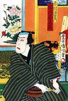 Ichikawa Sumizô V playing the role of Akama Genzaemon in the drama "Yowa Nasaki Ukina no Yokogushi" (print made by Toyohara Kunichika 1885) The Ichikawa Sumizô line of actors |