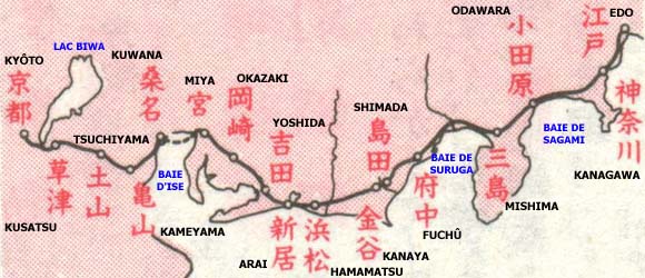 The Tôkaidô (literally the "Eastern Sea Route") was the most important communication road built by the Tokugawa Shogunate: "From Edo it led down the magnificent Pacific coast, where mountains meet suddenly with ocean to form some of the most fascinating natural scenery imaginable. Midway it turned inland, crossed through a range of majestic snow-capped mountains, and passed the beautiful Lake Biwa before reaching Kyôto. This was one of a number of highways built by the Tokugawa government to facilitate administration. It was always kept in good condition, and stopping places, or "stages," were maintained at fifty-three points along the way." (Takahashi Seiichirô and Charles Terry in "Andô Hiroshige") |