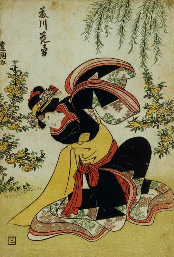 The actor Fujikawa Kayû II playing the role of Okumi in the drama "Sumidagawa Gonichi no Omokage", which was staged in the 3rd lunar month of 1810 at the Moritaza (print made by Utagawa Toyokuni I) |