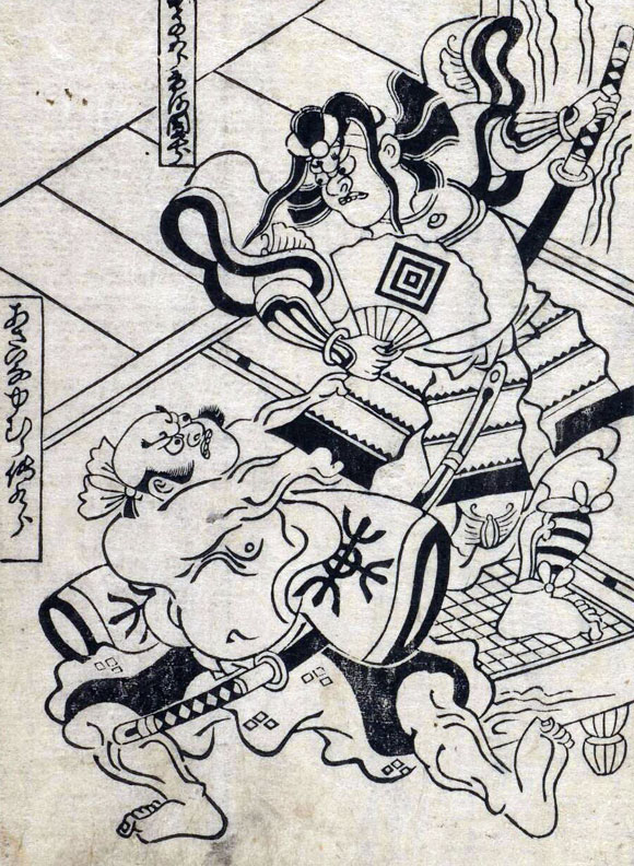 Nakamura Denkurô I (bottom/left) and Ichikawa Danjûrô I (top/right) playing the roles of Asahina no Saburô and Soga Gorô Tokimune in the 2nd scene of the 4th act of the drama "Tsuwamono Kongen Soga", which was staged in the 5th lunar month of 1697 at the Nakamuraza |