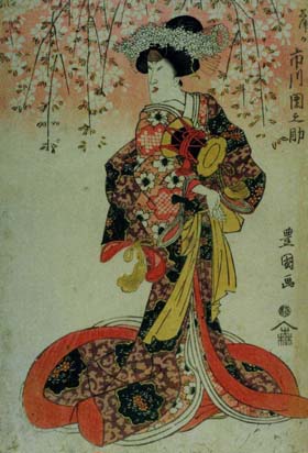 Nakamura Shikan II (left) and Segawa Kikunojô V (right) playing the roles of Tokaiya Ginpei (in reality Taira no Tomomori) and Ginpei's wife Oryû (in reality Suke-no-Tsubone) in the "Tokaiya" scene of the drama "Yoshitsune Senbon Zakura", which was staged in the 3rd lunar month of 1829 at the Nakamuraza (print made by Utagawa Kunisada I) |