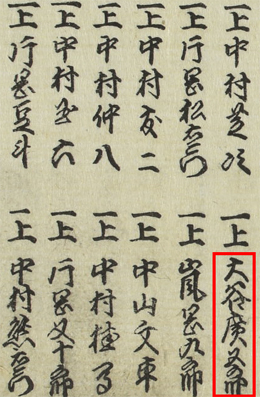 The name of Ôtani Hirogorô II in the 1853 Ôsaka hyôbanki (the zone within the red box) |