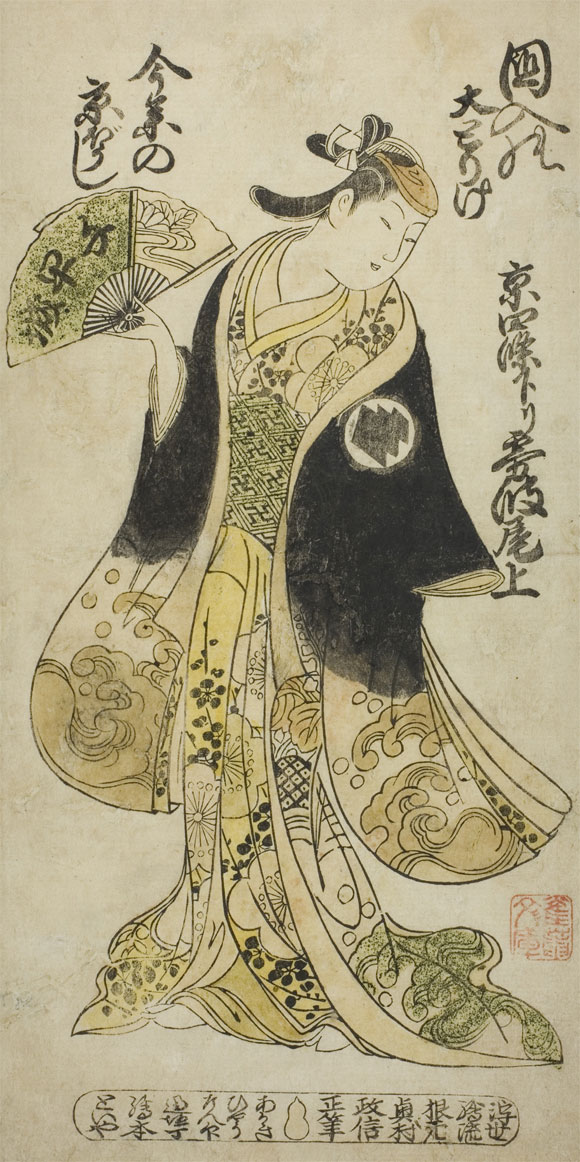 Existence: ??? ~ ??? Connection: Master: Kirinami Senju II Career: 1700s: born and trained in Kyôto by his master Kirinami Senju II. He received the stage name of Kirinami Onoe at an unknown date. 2nd lunar month of 1714: Onoe was recorded for the first time in Kyôto, where he performed as a wakashugata in the kaomise drama "Tarôzuki Wakô no Ônuki", which was produced at Hoteiya Umenojô's theater by Nakamura Shingorô I. 11th lunar month of 1714: Onoe performed in Kyôto in Sadoshima Saburôzaemon's kaomise drama "Yorozuyo Saiwai Gura", which was staged at Miyako Mandayû's theater. 11th lunar month of 1715: Onoe performed in Kyôto in the kaomise drama "Chiyogasane Kiku no Shinpai", which was produced by Yamatoyama Jinzaemon I for the nadai Hayagumo Chôdayû. 11th lunar month of 1716: Onoe became wakaonnagata and performed in Kyôto in the kaomise drama "Tatsu no Miyako Ikuyo no Yonedawara", which was produced by Yamatoyama Jinzaemon I. 11th lunar month of 1717: Onoe performed in Kyôto in Sakakiyama Kansuke I's kaomise drama "Ômu Gaeshi Momotose Gitsune", which was produced by Sakakiyama Shirotarô I at Hayagumo Chôdayû's theater 11th lunar month of 1718: Onoe played in Kyôto the role of Chidori-no-Mae in Adachi Saburôzaemon's kaomise drama "Shiga no Miyako Kogane no Hanazono", which was produced by Yamatoyama Jinzaemon I for the nadai Ebisuya Kichirôbê. 11th lunar month of 1719: Onoe performed in Kyôto at Miyako Mandayû's theater in Sadoshima Saburôzaemon's kaomise drama "Shôjô Zakaya Mannen-gura". 1st lunar month of 1720: Onoe played in the same theater the role of Princess Uta in the new year ni-no-kawari drama "Keisei Hachimannichi". 11th lunar month of 1720: Onoe played in Kyôto at Miyako Mandayû's theater the role of Princess Ozasa at Miyako Mandayû's theater in the kaomise drama "Gosha no Yonegura Fukki no Aimuko", which was produced by Sawamura Chôjûrô I. 1st lunar month of 1721: Onoe played in the same theater the role of Omitsu (later the keisei Shinzô) in the new year ni-no-kawari "Keisei Tôyama Matsu". 11th lunar month of 1721: Onoe played in Kyôto at Miyako Mandayû's theater the role of Omatsu in the kaomise drama "Inari Fuku In'yô no Kanegura", which was produced by Sawamura Chôjûrô I. 1st lunar month of 1722: Onoe played in the same theater the role of the keisei Kichô in the new year ni-no-kawari drama "Keisei Chikai no Kôbai". 11th lunar month of 1722: Onoe played in Kyôto at Hoteiya Umenojô's theater the role of the keisei Ôsaka in Yoshida Rôfu's kaomise drama "Aioi Ôshimadai", which was produced by Ogino Yaegiri I. 11th lunar month of 1723: Onoe played in Kyôto the role of Jûsuke's nyôbô Omatsu in Fukuoka Yagoshirô's kaomise drama "Teono Hajime Kogane no Ishizue", which was produced by Segawa Kikunojô I. 11th lunar month of 1724: Onoe played in Kyôto at Hayagumo Chôdayû's theater the role of Princess Yatsu in the kaomise drama "Sanmen Daikoku Mangoku Dawara", which was produced by Mihogi Gizaemon I and celebrated the shûmei of Onoe Gonbê. 11th lunar month of 1725: Onoe played in Kyôto at Kameya Kumenojô's theater the role of a young lady disguised as Princess Komatsu in Azuma Sanpachi's kaomise drama "Senzai Gura Sangai Matsu", which was produced by Arashi Jûjirô. 11th lunar month of 1726: Onoe played in Kyôto the role of the keisei Naniwazu in the kaomise drama "Shinzô Kishi no Himematsu" which was produced by Sanogawa Mangiku. Fall 1727: Onoe went to Edo. 11th lunar month of 1727: Onoe played at the Nakamuraza the role of Takehara's musume Ozasa in the kaomise drama "Yatsumune Taiheiki" [more details], which welcomed back in Edo the actor Ôtani Hiroji I and celebrated the first stage appearance of Ichikawa Masugorô. 1st lunar month of 1728: Onoe's rank in the Edo hyôbanki, wakaonnagata section, was jô-jô-(shiro)hankichi (superior - superior - (white) half excellent) [visual]. He played in the same theater the role of Kewaizaka no Shôshô in the new year sogamono drama "Soga Hôraisan"; the roles of Kudô Saemon Suketsune, Soga Gorô Tokimune, Soga Jûrô Sukenari and Ôiso no Tora were played by Ogawa Zengorô I, Ichikawa Danjûrô II, Sawamura Sôjûrô I and Sanjô Kantarô II. Fall 1728: Onoe went back to Kyôto; he fell sick but quickly recovered. 11th lunar month of 1728: Onoe played in Kyôto at Ebisuya Kichirôbê's theater the role of Gennai's nyôbô Wakamatsu in the kaomise drama "Mandai Toshigoyomi", which was produced by Kikukawa Kichitarô. 1st lunar month of 1729: Onoe's rank in the Kyôto hyôbanki, wakaonnagata section, was jô-jô (superior - superior) [visual]. He also played in the same theater the role of the keisei Tamahashi in the new year ni-no-kawari drama "Keisei Obasuteyama". 11th lunar month of 1729: Onoe played in Kyôto the role of the keisei Miyoshino in Azuma Sanpachi's kaomise drama "Yomeiri Shichigosan", which was produced by the zamoto Arashi Koroku I for the nadai Daikokuya Takenojô. 12th lunar month of 1729: Onoe played in the same theater the role of Mikasa-mura Osaku in the drama "Daidairi Ôtomo no Matori". 15th day of the 2nd lunar month of 1730 [1]: a fire destroyed or damaged several buildings in the theater district; The troupe, led by Arashi Sangorô I, moved to the district of Kitano Senbonmatsu. 2nd lunar month of 1730 [2]: Onoe played in Kitano Senbonmatsu the role of Mikasa-mura Osaku in the drama "Daidairi Ôtomo no Matori". 3rd lunar month of 1730: Onoe performed in the same theater in the drama "Hana no Keisei Dakurumida". No record afterwards. Comments: Kirinami Onoe was a Kyôto onnagata, who was active from the 1710s to the beginning of the 1730s. He was a promising actor but he disappeared from the record quite early. He performed mainly in Kyôto and spent one season in Edo. No record of any performance in Ôsaka. [1] The 15th day of the 2nd lunar month of the 15th year of the Kyôhô era was the 2nd of April 1730 in the western calendar. [2] From