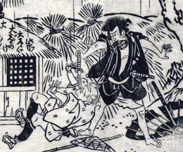 Ichikawa Nosuke (left) and Ichikawa Benzô II (right) playing the roles of Yoichibê and Ono Sadakurô in the 5th act of the drama "Kanadehon Chûshingura", which was staged in the 3rd lunar month of 1825 at the Kawarasakiza |