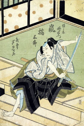The actors Arashi Kitsusaburô II (left print) and Ichikawa Danzô V (right print) playing the roles of Sasaki Tan'emon and Sawai Jôgorô in the "Engakuji" scene of the drama "Igagoe Dôchû Sugoroku", which was staged in the 9th lunar month of 1826 at the Kado no Shibai (print made by Asayama Ashiyuki) |