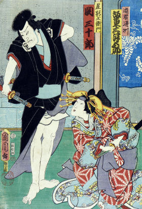 Act II, Scene 1: Gojôzaka Nakanochô Several years have passed. Suzaki Kakuya is now known as Gorozô, and has become an otokodate. Owing to their financial difficulties, Tsuji has agreed to sell herself into prostitution (miuri), and has become a keisei known by the name of Satsuki. Hoshikage Doemon, who is now a rônin, and who is also in Edo, has become a fencing instructor. It is Spring in Gojôzaka, and Gorozô and Doemon, both accompanied by their followers, meet for the first time in years. Their respective henchmen [2], however, have recently had a brawl, in which Doemon's gang came off the worst. This only increases Doemon's resentment of Gorozô, and his desire for revenge. Their gangs are anxious to be at each other's throats again, and have to be repeatedly restrained by their masters. Doemon infuriates Gorozô by spitefully threatening to buy Satsuki's services - every night! Gorozô points out this is not possible for, as a married courtesan, Satsuki can refuse any potential clients she chooses. Doemon will have to make do with the maid! Doemon remarks that he might buy out Satsuki's contract (miuke), and then she will belong to him. Gorozô retaliates that since she is married already, even this could never make her truly his own. Tempers flare, and the two are about to draw their swords when Kabutoya Yogorô [3], the proprietor of the Kabutoya ageya, interposes and prevents them from fighting in front of his establishment, ultimately enforcing a fragile truce. Act II, Scene 2: Gojôzaka Kabutoya Okuzashiki Tomoenojô has bankrupted himself through his nightly visits to the keisei Ôshû. Despite having been dismissed from his service, Gorozô is still loyal to his former master, and has pledged to pay his debt of 200 ryô to the Hanagataya ageya. The debt is due this very night, but Gorozô has not managed to raise the money to pay it off. The scene opens with Satsuki reading a letter from her husband in which he begs her to help him find the sum, for if he cannot repay it, the disgrace to both himself and to the Asama House will be such that he will have to commit suicide in atonement. Satsuki is at a loss as to what to do. As a married courtesan, she has no regular admirer from whom she could borrow the money. Doemon, there in yet another attempt to buy her favours, has been eavesdropping, and enters, magnanimously offering to lend her the sum. Satsuki is initially overjoyed, but soon discovers there is a catch. In order to have the money, she must write a letter of divorce to Gorozô. Satsuki is devastated, for she still loves Gorozô, and has always loathed Doemon. However, accepting is a way of repaying her debt of gratitude to the Asama House, and of saving her beloved husband's life. She has little choice but to agree to Doemon's demands, and puts a brave face on it by pretending that she no longer loves Gorozô, since his financial state has forced her into prostitution, and he even finds it necessary to keep on extending her contract (enkiriba). Doemon's henchmen burst in to congratulate their master, and a party is soon in full swing. When Satsuki has written the letter of divorce, Doemon wants one of his lackeys to deliver it to Gorozô. Understandably, none of them is keen to do the job. However, at this moment, Gorozô enters - pursued by Yosuke, from the Hanagataya house, demanding repayment of the debt. This falls out better than Doemon could have devised, and the unfortunate Satsuki is forced to break off with Gorozô in a heart-rending scene in front of the assembled company, and with no opportunity to reveal to her husband the truth of the situation. Gorozô - wounded, maddened and publicly shamed - resolutely refuses to accept the money - much to the anguish of Yosuke. He denounces Satsuki, and makes to strike her with his shakuhachi when Ôshû rushes in and interposes herself. She has presumably heard what has been going on, and feels partly responsible for the situation. She tries to calm down the incensed Gorozô, and since she is Tomoenojô's beloved, Gorozô, out of respect for her and her lord, goes no further, but leaves, bitterly swearing vengeance. Doemon, who wishes to show off his prize to the world, commands Satsuki to accompany him to the Hanagataya. Satsuki, disgusted by him as well as shattered, feigns illness, but Ôshû once again steps in, and volunteers to take Satsuki's place. If she wears Satsuki's outer robe, and has her crested lantern carried before her, in the dark everyone will assume that it is Satsuki herself who is accompanying him. Doemon reluctantly agrees, though commanding that Satsuki follows as soon as possible. Before she leaves, Ôshû is slipped a letter by Satsuki, who asks her to deliver it to Gorozô to explain recent events. Satsuki is left alone, a broken woman, still clutching the packet of money which has cost her so dear. Act II, Scene 3: Kuruwa Uchi Yofuke In the dark in front of the Hanagataya lattices, Gorozô lies in wait, and when Doemon, Ôshû and their retinue appear, he attacks. Some of the party flee, and he easily drives off those who don't, until he and Ôshû are left alone. Taking her to be Satsuki, he repeatedly stabs her, in another scene of "beautiful cruelty", until she dies at his feet. There is more than one ending to this scene. When the Gosho no Gorozô section of the play is performed alone, it is usual for Gorozô to bend over Ôshû's body and realise his terrible mistake. Having killed his lord's beloved, he vows to take his own life - but to kill Doemon first. Doemon reappears, and the two fight, the curtain being drawn in the middle of this, although it is conventionally assumed that Doemon is killed (and just occasionally this is actually shown to happen). However, when a fuller version of the play is performed, with a further Act to follow, Gorozô, after killing Ôshû, cuts off her head (still without realising her true identity), and then proceeds to fight Doemon. However, 