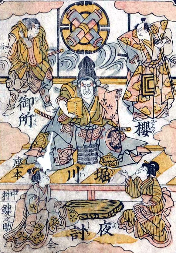 The play "Gosho Zakura Horikawa no Youchi" was originally written for the puppet theater (Bunraku) and staged for the first time in the 1st lunar month of 1737 in Ôsaka at the Takemotoza. It was adapted for Kabuki many years later and staged for the first time in the 4th lunar month of 1762 in Ôsaka at the Naka no Shibai [casting]. |