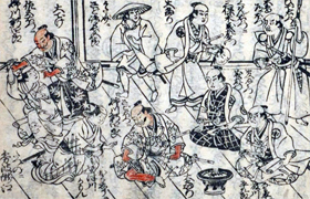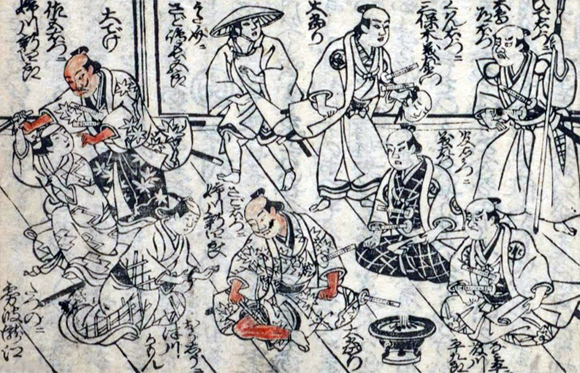 The kaomise drama "Sanpukutsui Eiga no Shikishi" was produced by Mihogi Gizaemon I at Miyako Mandayû's theater in Kyôto in the 11th lunar month of 1725 [1]. It was staged with the following casting: