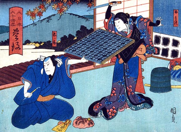 "Keya-mura", or "Keya-mura Rokusuke Sumika" ("at Rokusuke's home in the village of Keya"), is the 9th act of the 11-act drama "Hikosan Gongen Chikai no Sukedachi". It is the most popular and most staged part of this drama. |