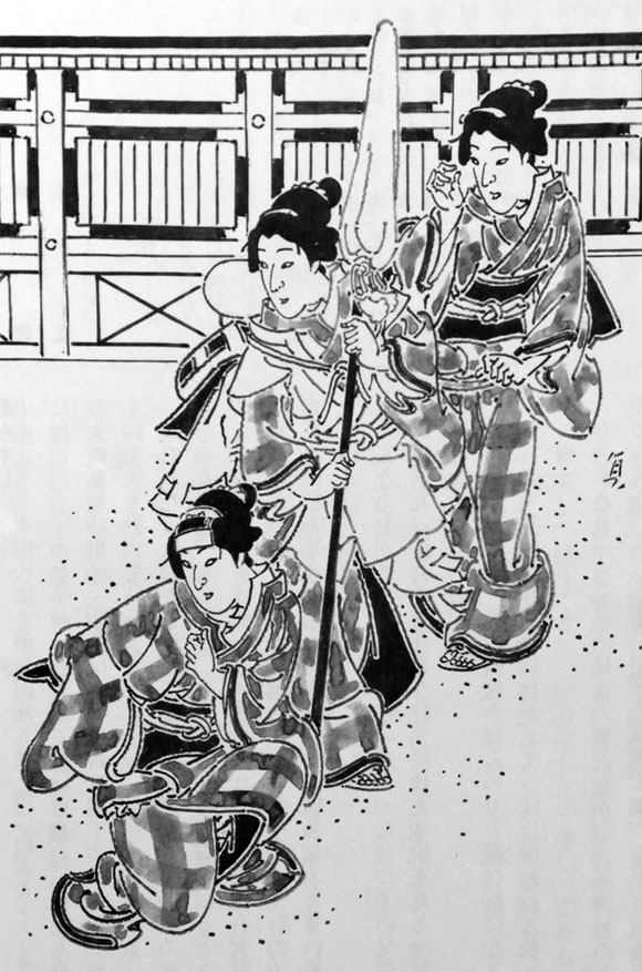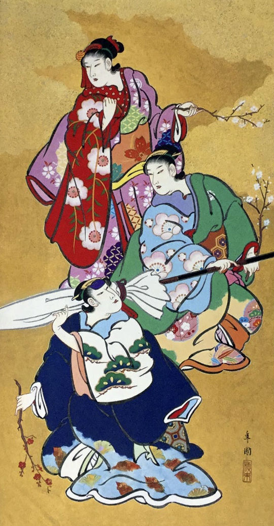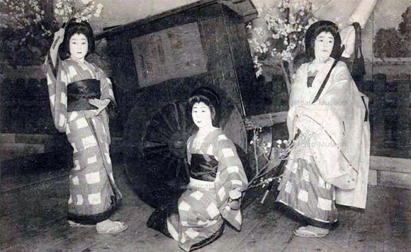 3 geisha performing in the dance-drama "Onna Kurumabiki", which was staged in February 1919 in Tôkyô at the Imperial Theater |