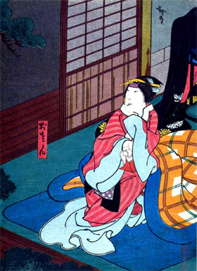 At the House of the Almanac Maker Ishun The house of the daikyôji Ishun, located in Kyôto in Shijô-Karasuma, is extremely busy, for it is the 1st day of the 11th lunar month, the first day for the distribution of the official almanac for the coming year and all the employees are engaged in the dispatch of the new almanacs. Ishun himself, however, is taking a nap because he is tired. He has visited the Imperial Palace, princes and nobles mansions to distribute the new almanac. The bantô Sukeemon, accompanied by a tedai, leaves the house to make a further distribution. With all employees gone, Osan, Ishun's wife, fondles her female pet cat while the maid, Otama, looks on. The cat struggles, scratches Osan's hand and escapes. Osan calls after the cat and runs off in pursuit of her. Otama is about to follow her when Ishun suddenly wakes up and tries to embrace her. Otama struggles and warns Ishun that she will call Osan if he does not release her. At the same time, Osan's mother arrives unexpectedly at the house. Ishun can't stay any longer and he goes away. Osan returns to receive her mother and leads her into an inner room. The tedai Mohê returns from a visit to customers. He is a little bit drunk as his customers have offered him to drink some sake. Osan comes to his side and confidentially asks him for help because her father is in financial difficulty. She wants to borrow money for a few weeks. She says her father is reluctant to ask Ishun's help because the almanac maker is greedy and it would embarrass Osan herself. Mohê, who is a young and easily impressionable young man (fascinated by the beautiful wife of his master), immediately volunteers to help Osan, who gladly goes away to report the good piece of news to her mother. Mohê was well intentioned but he has no money of his own at all. He quickly has a plan to borrow the money from a wholesaler in his master's name. He therefore draws a bill of exchange, affixing Ishun's seal to the forged document. This act is detected by the bantô Sukeemon, who has just returned. Sukeemon calls all in the house, including Ishun, and beats Mohê in their presence. Unable to reveal his true motive however, Mohê keeps silent though Ishun persistently demands his explanation. To save Mohê from further punishment, Otama falsely testifies that she has asked Mohê for a loan because her uncle has written her that he will commit suicide because he cannot pay off a long-standing debt. Osan and her mother, who have watched the interrogation of Mohê in fear of his revelation of the real reason, beg Ishun to pardon Mohê, but Ishun gets angrier than ever. Saying he will try Mohê the following day, Ishun orders to lock up the young man. Ishun invites Osan's mother to stay overnight at his home and leaves to visit Osan's father to tell him what has happened. After all have gone to bed, Osan stealthily visits Otama's room in order to thank her for her quick-witted help. Otama confides to Osan that she has acted out of love for Mohê. She also tells Osan of Ishun's persistent amorous advances to her. This, she says, is the reason why he became angrier when she offered her help to Mohê. This was the proof that the love she refused Ishun was reserved for Mohê. Otama also reveals that, every evening, Ishun goes out on some excuse and after all have gone to bed, secretly climbs over the fence of his own house and sneaks into Otama's bedroom. So far she has successfully rejected his advances by threatening to call his wife. But his announced departure to the house of Osan's father today is most probably yet another excuse to absent himself from his own room so that he may visit hers again. This revelation makes Osan both angry and jealous. Wishing to put her husband to shame, she asks Otama to exchange their bedroom for the night. She also exchanges her night clothes with Otama's. No sooner has Otama left for Osan's bedroom than Mohê comes in. He has broken out of confinement and has come to express his gratitude and to return her love to Otama. Mohê and Osan are unaware of getting the wrong person. They share the same bed in the dark without a word, each mistaking the other for another person. Late at night Ishun comes back and violently knocks at the door. Sukeemon wakes up and light a lantern to receive him. The light causes Osan and Mohê to discover themselves and to be themselves discovered by both Sukeemon and Ishun. Bairyû's House in Okazaki Sukeemon visits at night the house of Akamatsu Bairyû, a rônin and professional story-teller. He is also Otama's uncle. Sukeemon comes with a palanquin carrying Otama tied with a rope. When Sukeemon asks Bairyû to keep Otama in his custody, Bairyû accuses Sukeemon of binding her without authority. He takes over Otama only after he has beaten Sukeemon with a pole and made him undo the rope binding her. Sukeemon, muttering revenge, is carried away in the palanquin. Osan and Mohê, who fled from Ishun's house when their adultery was discovered, come to the front of Akamatsu Bairyû's house and, eavesdropping on the conversation within the house, hear Bairyû advising Otama to accept execution with good grace since she cannot be exonerated from the charge of having helped the adultery. The lovers listen silently and weep. Osan's father and his wife are on their way to a Buddhist temple. They find Osan and Mohê on the road. The father gets very angry but, out of pity, his wife gives the two lovers money to help them escape to Mohê's hometown in Tanba Province. The Lovers' Hideout in the Tanba Province On the first Day of the New Year, some street entertainers sing a song in front of the hideout of Osan and Mohê in the Tanba Province. As Osan gives some money to the leader, he recognizes her as Ishun's wife, for he has frequently visited Ishun's house in Kyôto. Osan bribes him with more money and asks him not to tell anyone about her presence. Mohê comes back from a visit to a local shrine and tells Os