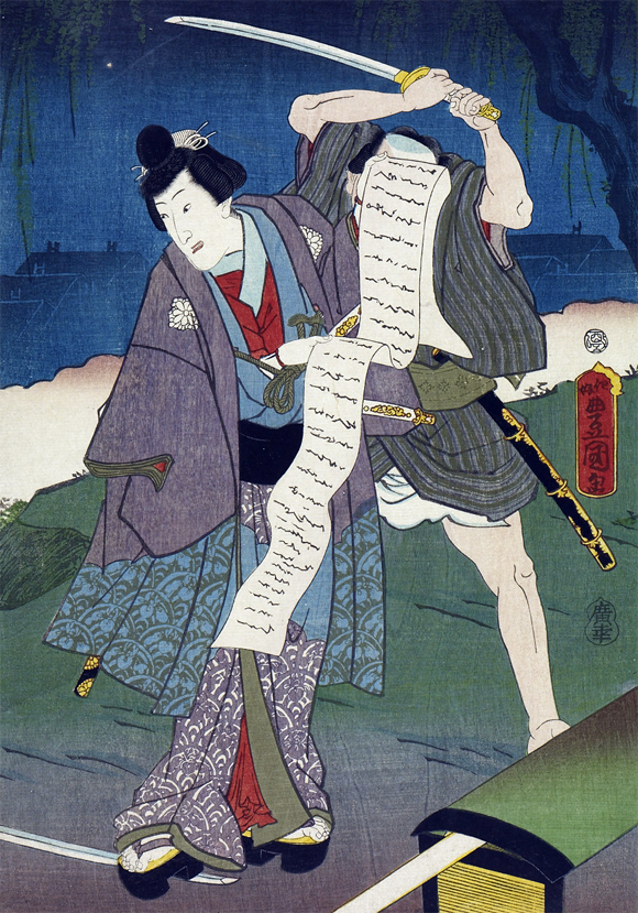 The actors Asao Yoroku II and Iwai Kumesaburô III playing the roles of Tanasuke and the daijin Shiranui in the drama "Shiranui Monogatari" in a mitate-e print made in 1861 by Utagawa Toyokuni III |