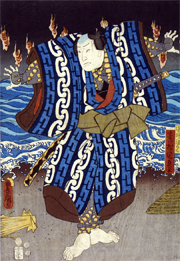 The actor Asao Yoroku II playing the role of Tanasuke in the drama "Shiranui Monogatari" in a mitate-e print made in 1861 by Utagawa Toyokuni III |