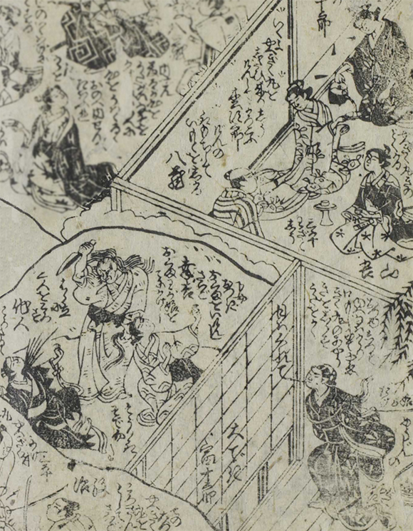 An illustration from the ezukushi banzuke for the staging of the drama "Sode Nikki Banshû Meguri" in the 3rd lunar month of 1779 in Ôsaka at the Kado no Shibai The end of Act V (bottom), Act VI ("At Innami Naizen's Mansion") and the dance-drama "Kane-ni Urami Kasane Furisode" (left), with Nakamura Tomijûrô I, Arashi Hinasuke I, Onoe Shinshichi I, Fujikawa Hachizô II, Arashi Sanjûrô IV, Fujikawa Sango, Mimasu Tanin II and Arashi Matsujirô I in the roles of Toya Otsuyu, Innami Naizen, Ikuta Hyôgonosuke, Kakogawa Sanpei, the tabakoya Koichi, Momonoi Yaegikumaru, the yakko Nadahei and Naizen's younger sister Ikuyo |
