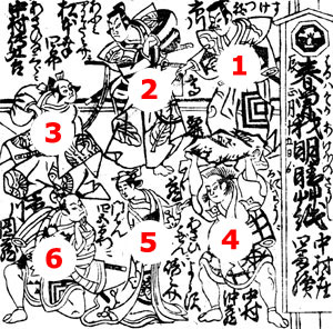 The actors Ichikawa Yaozô II (top/left), Nakamura Shôchô (top/right), Iwai Hanshirô IV (center/left), Nakamura Nakazô I (center/right), Nakamura Shichisaburô III (bottom/left) and Ichikawa Sumizô I (bottom/right) playing the roles of Soga Jûrô Sukenari, ???, Tsukisayo, Oniô Shinzaemon, ??? and ???