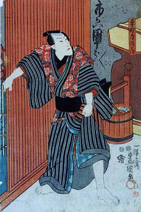The play "Sonezaki Shinjû" was originally written for the puppet theater (Bunraku) and staged for the first time in Ôsaka at the Takemotoza in the 5th lunar month of 1703. It was based on a real event that happened in Ôsaka in the 4th lunar month of 1703. "Sonezaki Shinjû" was adapted for Kabuki a few years later and staged for the first time in the 4th lunar month of 1719 at the Nakamuraza in Edo. The roles of Hiranoya Tokubê and Tenmaya Ohatsu were played by Ichikawa Danjûrô II and Sanogawa Mangiku. It was regularly performed up to the thirties in the twentieth century. "Sonezaki Shinjû" was revived in August 1953 at the Shinbashi Enbujô, starring Nakamura Ganjirô II and his son Nakamura Senjaku II in the roles of Hiranoya Tokubê and Tenmaya Ohatsu. They achieved such a great success that the play became one of the most popular ones in the Kabuki repertoire. Nakamura Ganjirô II and his son Nakamura Senjaku II performed it together 645 times, either in the main theaters or on tour all over Japan. In December 1980, at the Minamiza (Kyôto), Nakamura Tomotarô had to replace definitively his grandfather Nakamura Ganjirô II, who fell sick, in the role of Tokubê. The new duet was as successful as the first duet and the 16th of january 1995 Nakamura Ganjirô III celebrated on the stage of the Nakaza in Ôsaka his 1000th performance in the role of Ohatsu. |