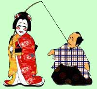 A daimyô and his servant Tarôkaja go on a pilgrimage to the Nishinomiya shrine in order to pray the Ebisu God and get their main wish granted: finding a perfect spouse. After the prayers, they decide to spend the night in the precincts of the shrine, waiting for the answer of the Ebisu God. The daimyô and Tarôkaja have the same premonitory dream, in which the God tells them that a woman will be waiting for them at the Western gate of the shrine in the morning. The 2 men wakes up and rush to the western gate. They find a fishing rod near a little pond and decide to use it to fish for their future spouse. The daimyô tries first and catches a veiled woman. He lifts up the veil and discovers a beautiful princess. He immediately asks if he could marry her. The Princess accepts and Tarôkaja, who had the good idea to bring a bottle of sake, decides to celebrate the wedding on the spot. After the libations, it is the turn of Tarôkaja to fish for a bride. He catches another veiled woman and starts to court her. She accepts his advances and Tarôkaja lifts the veil ... finding an amazingly ugly and manly woman, strong like a woodcutter. Tarôkaja tries to run away but the woman vigorously hangs on him. The daimyô kindly laughs at him, telling him to respect the decision of the God. Tarôkaja has no choice but resigning himself. He decides to dance to celebrate the coming wedding, while he ugly woman rushes at the bottle of sake and quickly drinks it, just like a drunkard of the worst kind. It is time to leave the shrine and go back to the mansion. The daimyô and the Princess are the first to depart, followed by the ugly woman, who pulls with the fishing rod the unfortunate Tarôkaja. |