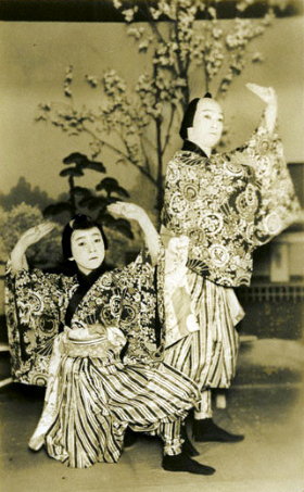 The actors Nakamura Matagorô II and Bandô Mitsugorô VII playing the roles of a kogaikotsu and a gaikotsu (later a child and parent yomiuri) in the dance-drama "Yami no Ume Hyaku Monogatari", which was staged in January 1927 at the Hongôza |